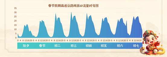 今年春节假期高速公路出口流量预计较去年有所增长,预计从假期第四天(年初三)起返程车流持续增加,路网将迎来出行高峰,假期最后一天(年初七)预计达到春节假期单日出口流量高峰。省内高速公路日流量分布呈现“前平稳后达峰”态势,每日路网流量分布均呈现典型“M”双峰特征,其中早高峰出行集中在7:00-12:00,晚高峰出行集中在16:00-18:00,且峰值与持续时间均高于早高峰。