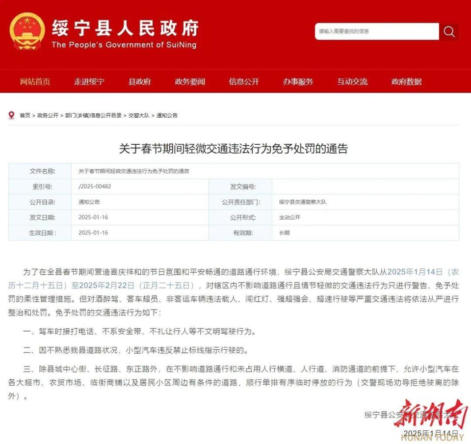 (绥宁县《关于春节期间轻微交通违法行为免予处罚的通告》。图源:绥宁县人民政府网站)