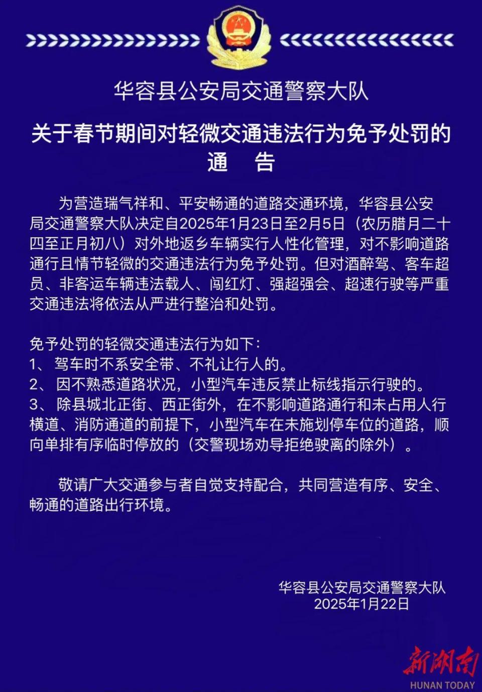 1月22日,岳阳市华容县公安局交通警察大队发布通告,2025年1月23日至2月5日,对外地返乡车辆实行人性化管理,对不影响道路通行且情节轻微的交通违法行为免予处罚。通告同时着重提到,将对酒醉驾、客车超员、非客运车辆违法载人、闯红灯、超强超会、超速行驶等严重交通违法将依法从严进行整治和处罚。