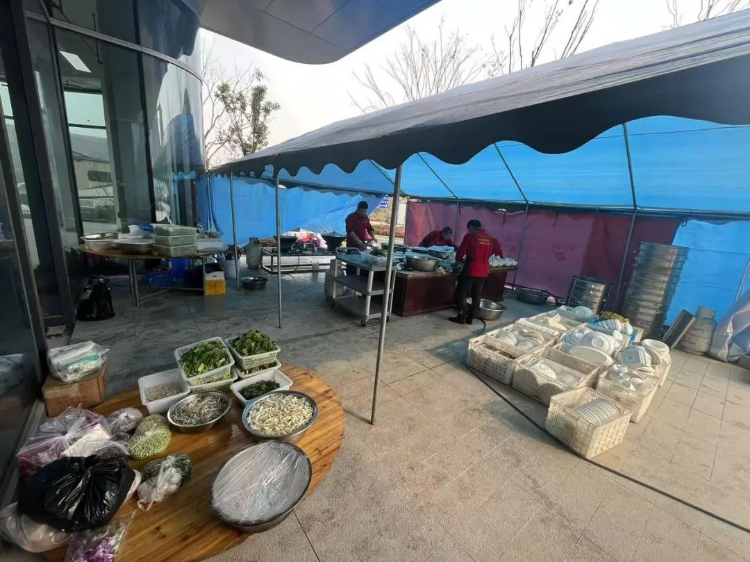 当天午休刚结束,不少人就发现楼下空地架起了一个个棚子,“吃席的感觉瞬间就来了。”为了完成这场大席,许多人加入了后勤工作,“有人搬桌子,有人运食材,还有人负责摆酒水。”