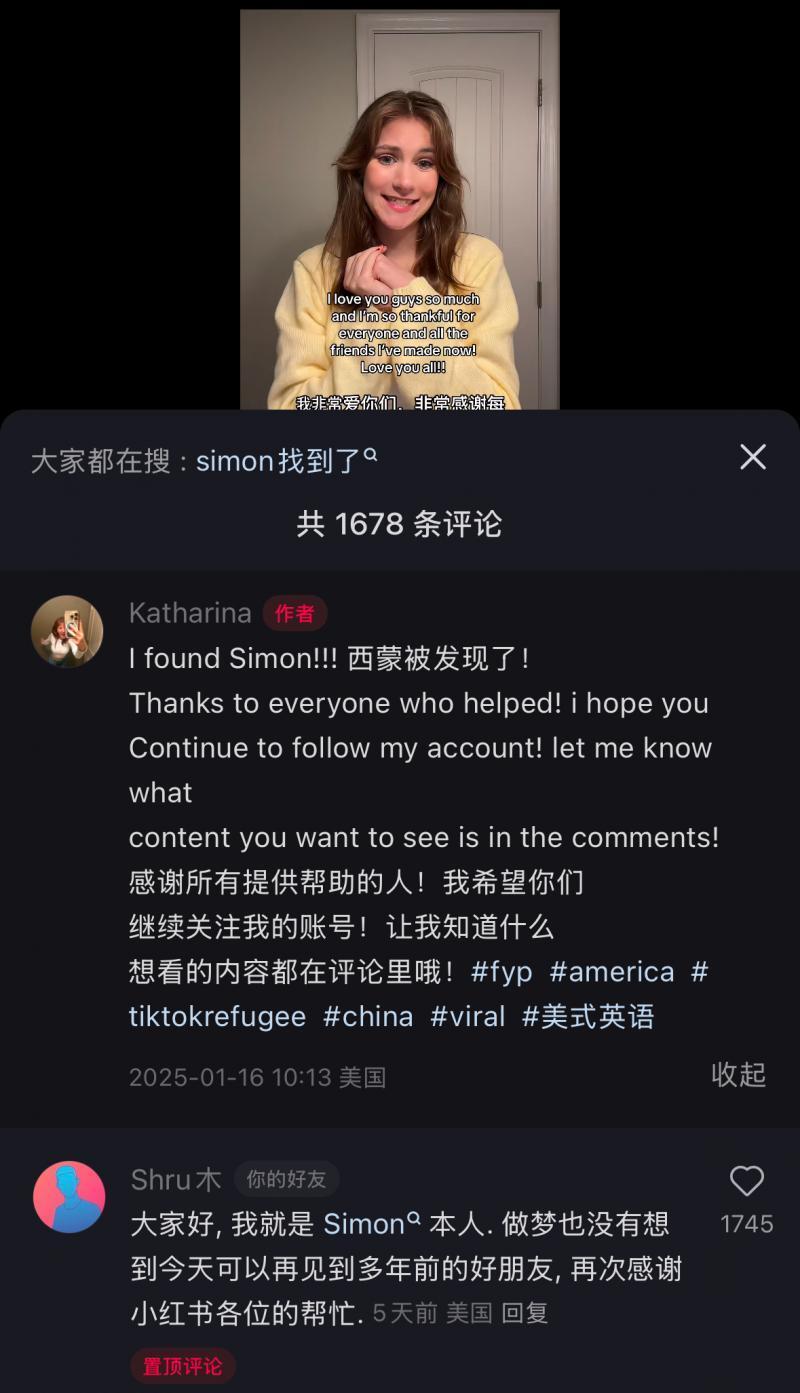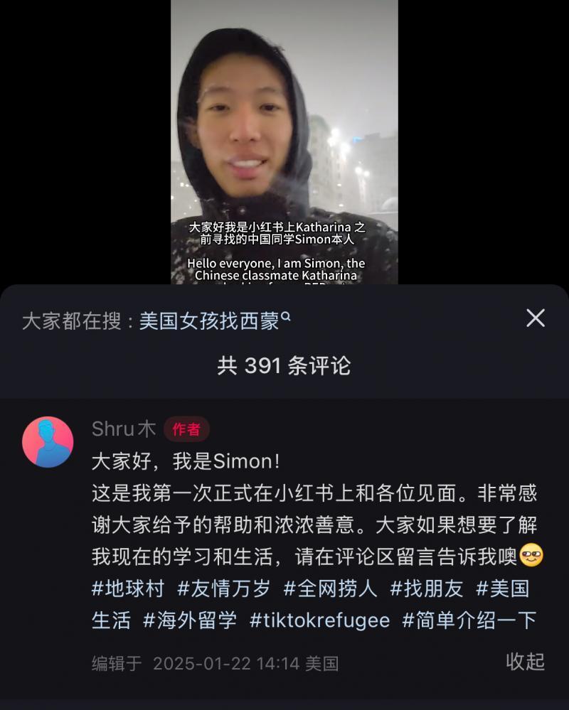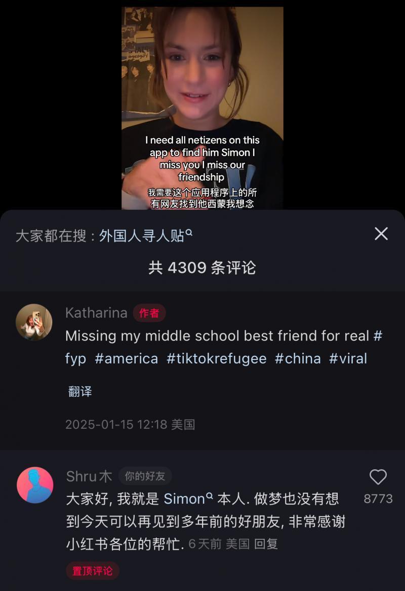 最终,西蒙的一个高中朋友起到了关键作用,他刷到卡塔琳娜的视频后,转发给了西蒙,又私信联系了卡塔琳娜。西蒙本人也在卡塔琳娜寻人视频的评论区留言:“做梦也没有想到今天可以再见到多年前的好朋友,非常感谢各位的帮忙”。于是,在小红书,卡塔琳娜和西蒙重新取得了联系,并交换了在美国的社交账号。