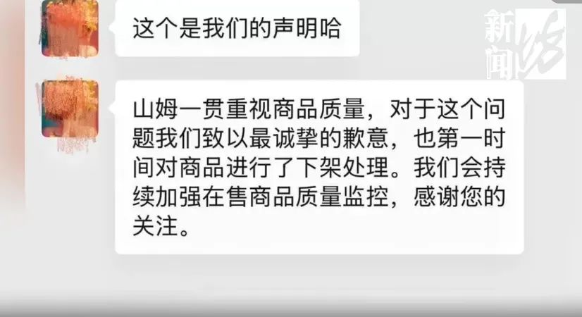 随后,记者联系了山姆超市的全资母公司——沃尔玛(中国)投资有限公司,相关工作人员得知记者的来意后,仅仅给出了简单的回复称:山姆一贯重视商品质量,对于这个问题我们致以最诚挚的歉意,也第一时间对商品进行了下架处理。