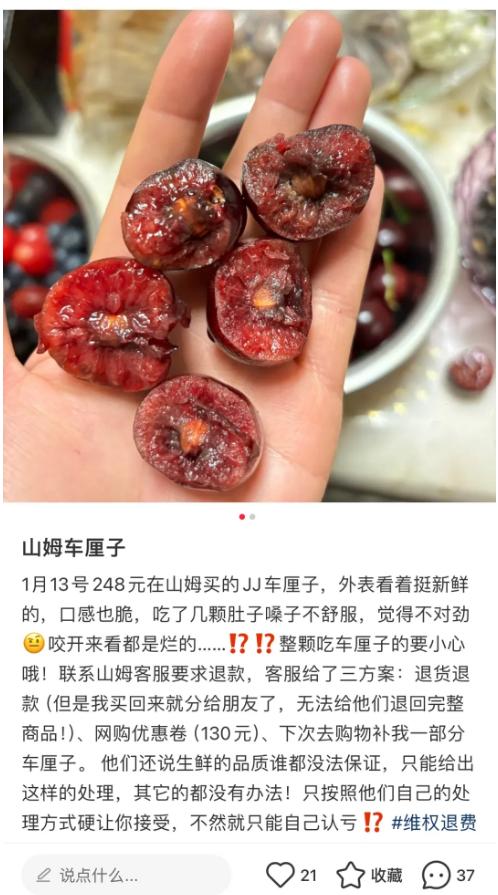 同样是一位IP为江西的消费者发帖表示,买了JJ车厘子,外表看着挺新鲜的,结果咬开来都烂了。山姆客服只能给出130元优惠券补偿或补一部分车厘子的处理。