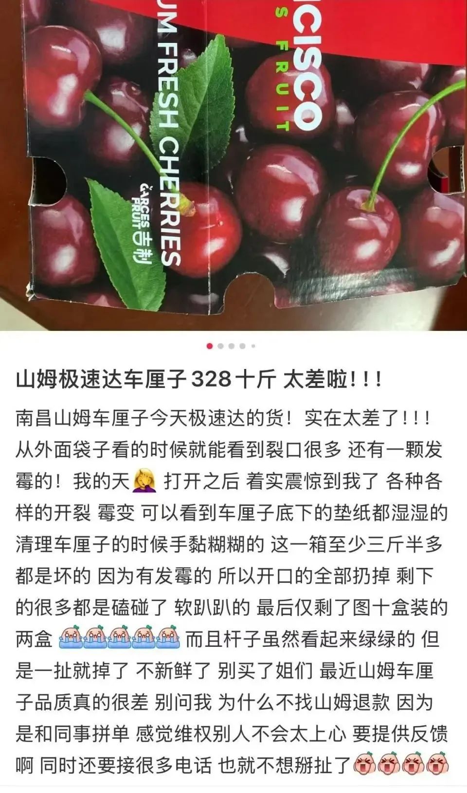 记者注意到,一位IP为江西南昌的消费者发帖称,自己通过南昌山姆极速达购买了十斤车厘子,品种为拉宾斯,价格为328元。“打开之后,各种各样的开裂、霉变,可以看到车厘子底下的垫纸都湿湿的。”其称,一箱内至少有三斤为坏果,由于跟同事拼单就没有退货。