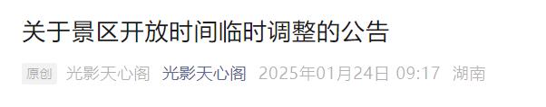 2025年1月24日,“光影天心阁”发布《关于景区开放时间临时调整的公告》,内容如下: