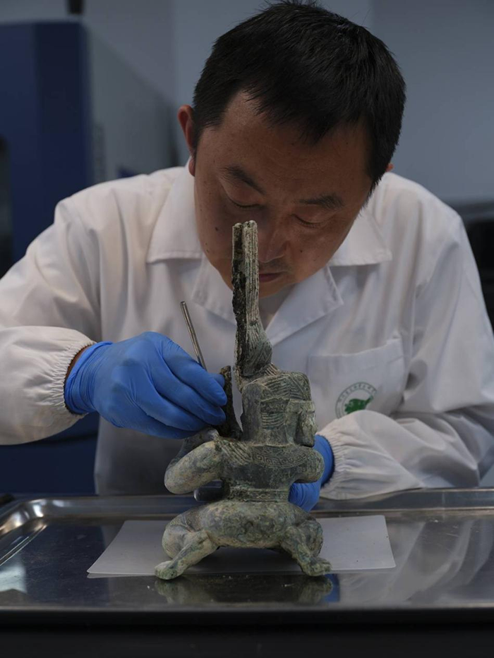 文物保护工作者正在清理青铜扭头跪坐人像 图据四川省文物考古研究院