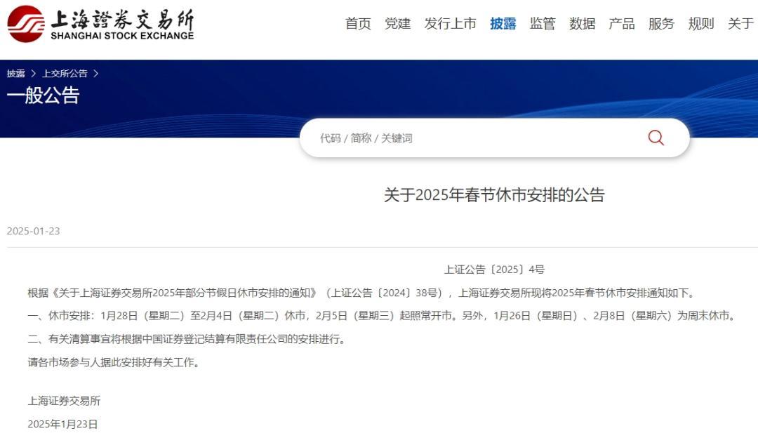 根据《关于上海证券交易所2025年部分节假日休市安排的通知》(上证公告〔2024〕38号),上海证券交易所现将2025年春节休市安排通知如下。