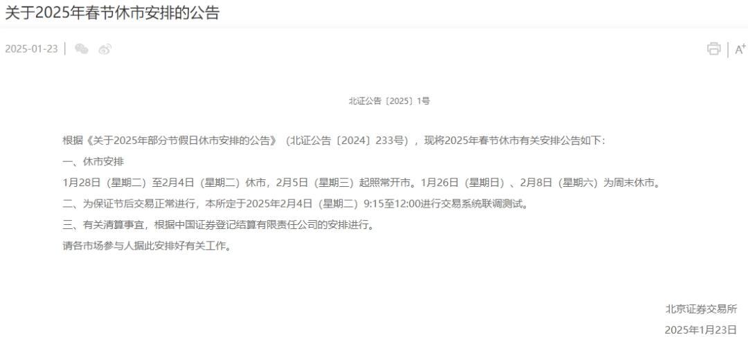 根据《关于2025年部分节假日休市安排的公告》(北证公告〔2024〕233号),现将2025年春节休市有关安排公告如下: