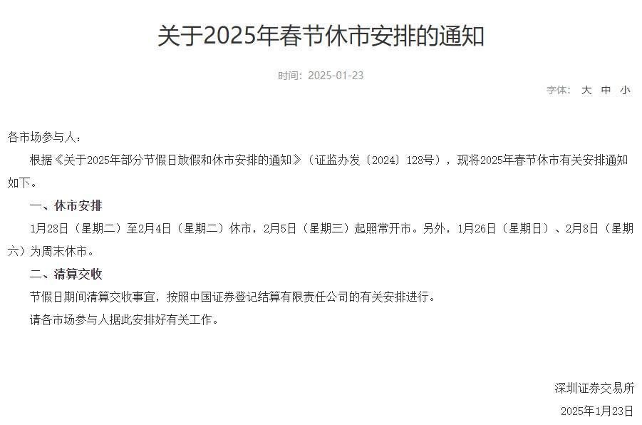 根据《关于2025年部分节假日放假和休市安排的通知》(证监办发〔2024〕128号),现将2025年春节休市有关安排通知如下。