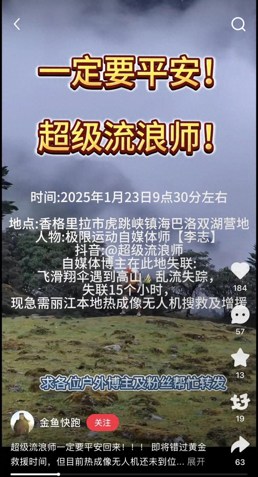1月24日凌晨1时,网友“金鱼快跑”在社交平台账号发布求救消息称,其男友户外极限运动博主“超级流浪师”李志于1月23日9:30在云南省迪庆藏族自治州香格里拉市虎跳峡进行滑翔伞运动时遇险失联,截至发稿时已27小时,云南省登山户外运动协会已组织救援队到达现场进行搜救。