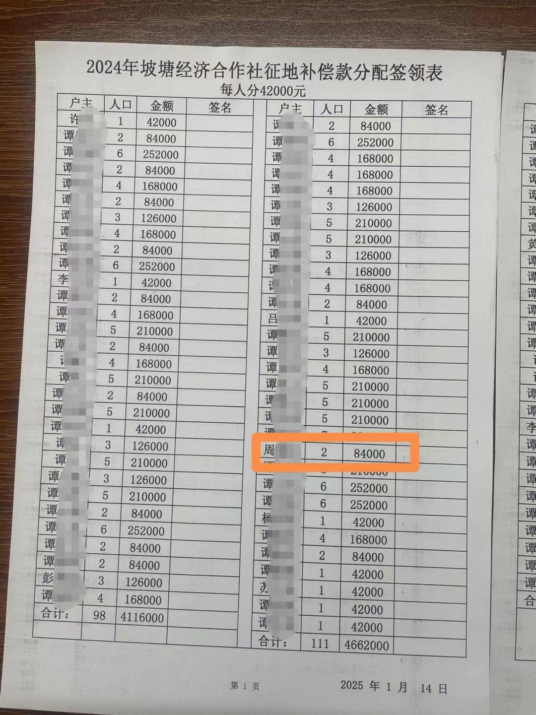 除了村集体提供的福利,村集体农村经济组织成员还享有土地征收的地价补偿。据谭女士提供的《2024年坡塘经济合作社征地补偿款分配领签表》可知,2025年1月15日,坡塘经济合作社2024年共分发了土地征收款4662000元,其中谭女士一家在册登记人口2人,共分配得84000元。