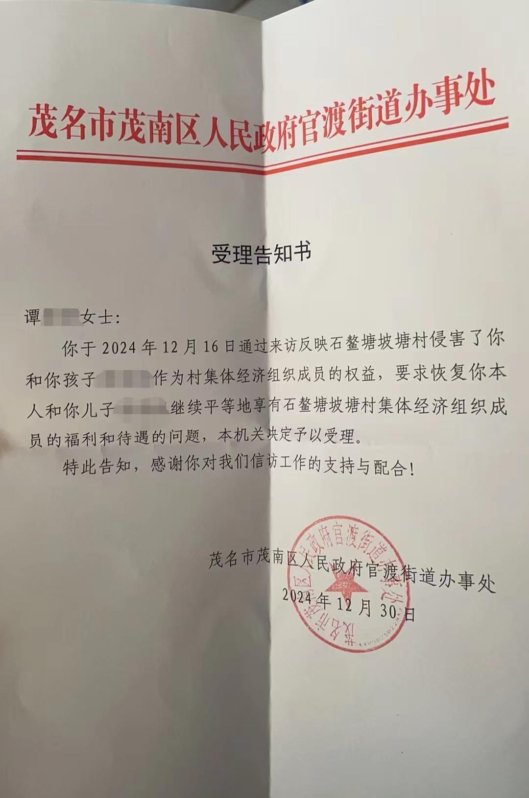 谭女士介绍,他们一家两年前曾起诉过此事,“但(我们)起诉方向不对,目前在准备重新起诉。”近日,她们一家也前往茂名市茂南区人民政府官渡街道办事处信访部门咨询上访,并拿到了受理告知书。