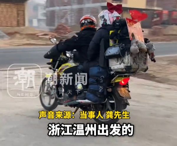 龚先生和妻子在温州的一家啤酒厂打工,已经有几年了。年关将至,春节的气息愈发浓烈,他们决定骑着摩托车返回贵州老家,2400公里的距离并不近,但在他看来,这种出行方式很自由,而且现在家家户户马路修到家门口,到时候过年走亲戚也方便,比开车更省心。他们已经连续四年骑车返乡。