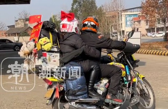 1月24日,贵州黔西南。男子带妻子骑摩托车2400多公里返乡过年,用了6天4夜的时间,从浙江温州到贵州黔西南。当事人龚先生称,已经安全到家了,他觉得自己骑行更有意义,加油花费五百多元,向往自由的感觉。