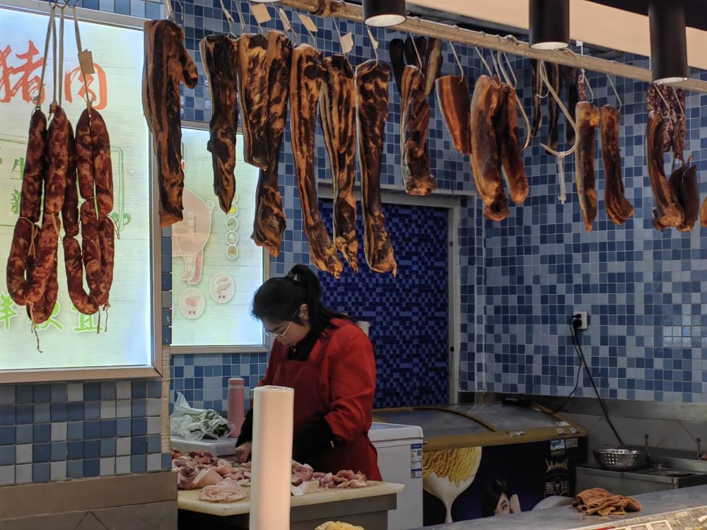 市民李女士每年都会来这里灌香肠,或买肉回去腌制。“腊肉和香肠的制作,不只是一种技艺,更是情感的传递。每年除夕,一家人团团圆圆地吃着腊肉和香肠,是我们最温暖的年味记忆。”她感慨道。