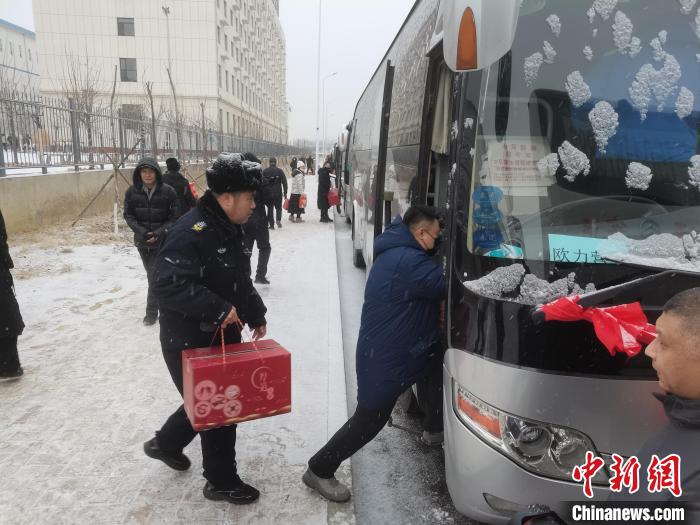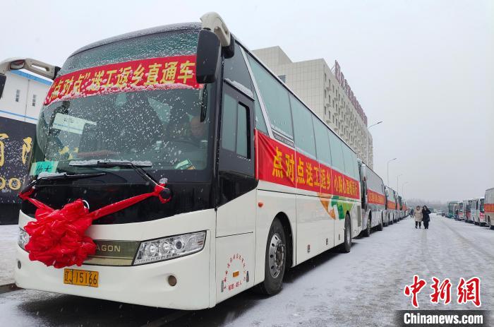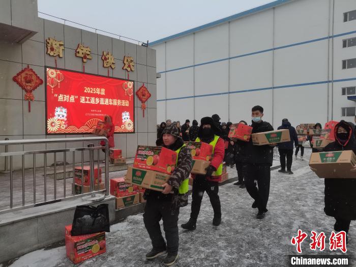 中新网阜新1月26日电(李晛)1月26日,辽宁省阜新市“点对点”送工返乡直通车活动正式启动。当日,伴着细雪飘飞,辽宁正远食品有限公司准备返乡过年的500余名务工人员脸上洋溢着喜悦,陆续来到集合地点,等待着返乡大巴的到来。