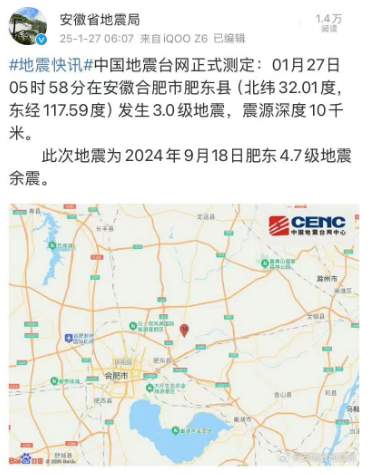 据@安徽省地震局:中国地震台网正式测定:01月27日05时58分在安徽合肥市肥东县(北纬32.01度,东经117.59度)发生3.0级地震,震源深度10千米。