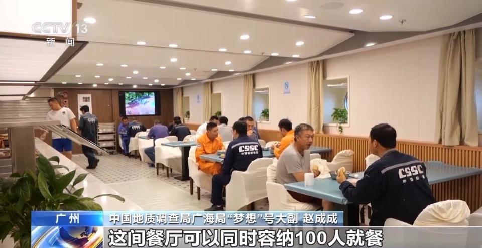 中国地质调查局广海局“梦想”号大副 赵成成:我们有洗衣房、健身房、餐厅,这间餐厅可以同时容纳100人就餐。我们的4层都有住舱,定员是180个人。