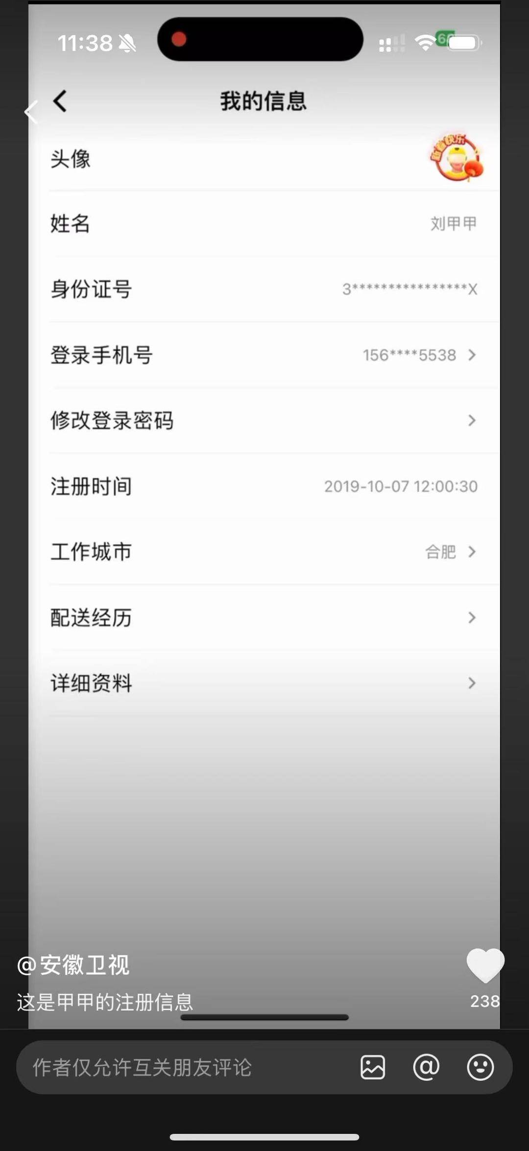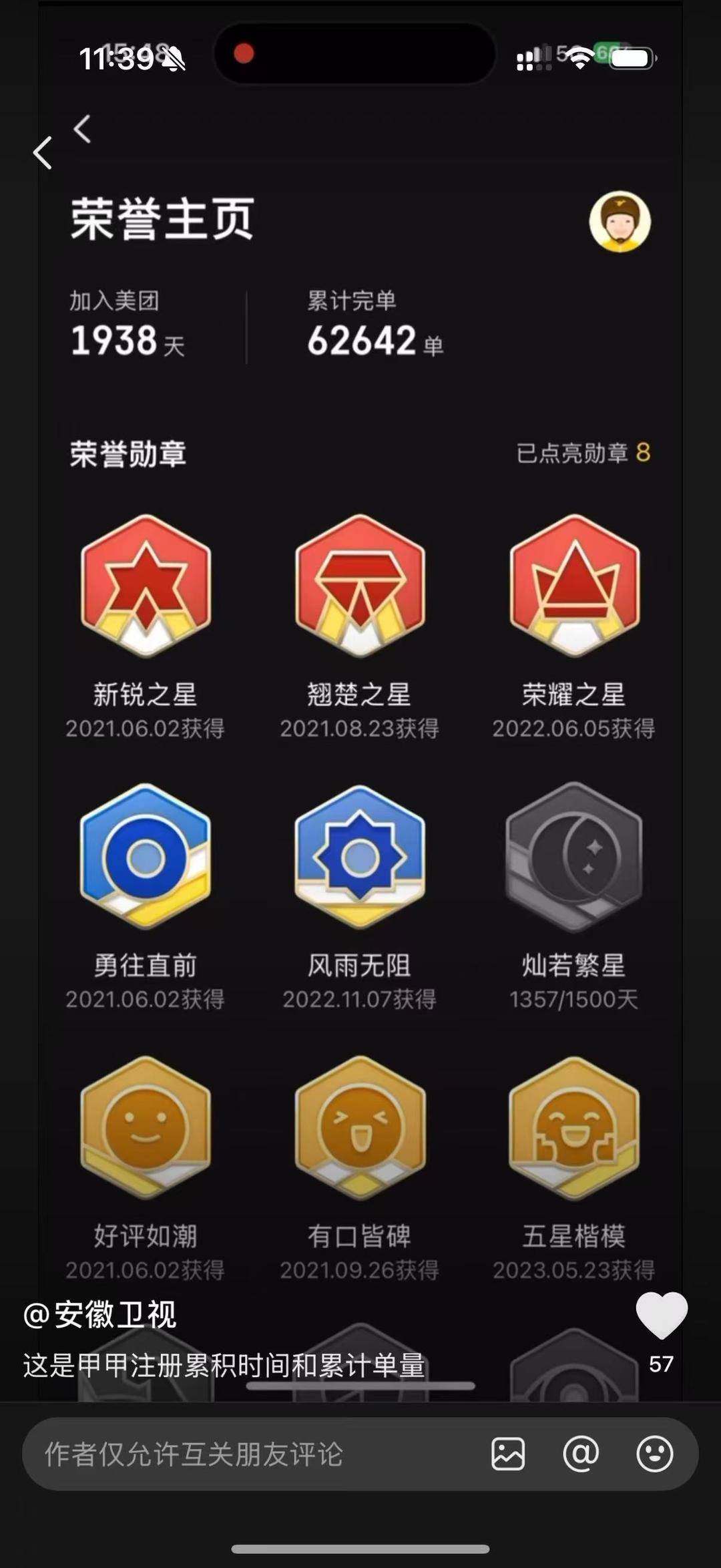 为回应网友质疑,刘佳佳在置顶视频中晒出外卖接单,显示“刘甲甲”加入美团1938天,累计完单62642单。这与安徽卫视声明中的时间吻合。
