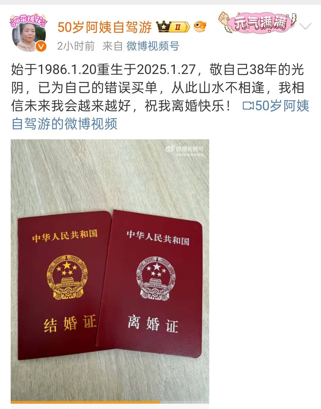 1月27日,因56岁自驾而走红网络的苏敏阿姨在社交平台晒出离婚证,配文:“始于1986.1.20重生于2025.1.27,敬自己38年的光阴,已为自己的错误买单,从此山水不相逢,我相信未来我会越来越好,祝我离婚快乐!”这一消息引发网友的广泛关注。