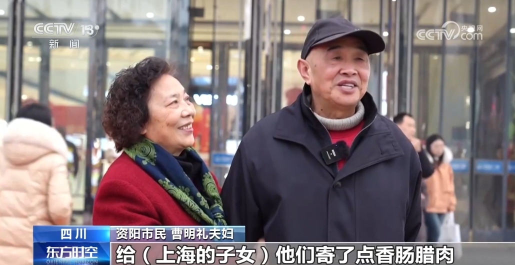 资阳市民曹明礼夫妇:老人总是牵挂孩子,给(上海的子女)他们寄了点香肠、腊肉。我们老两口就在资阳过新年了,什么礼物也不需要,就是多一点问候就行,抽空视频问候问候就行。