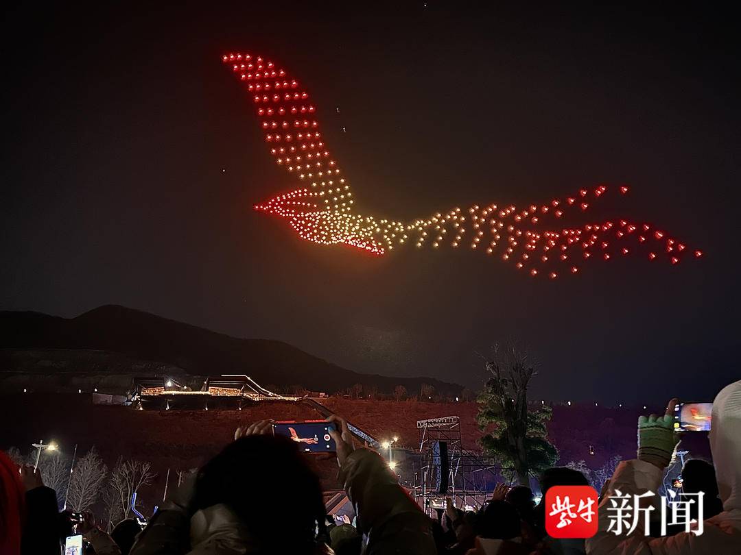 记者在现场看到,夜空中烟花绚烂夺目,500架无人机如同被施了魔法,在高空次第亮起成凤凰、仙鹤等形状,“飞流直下三千尺,疑是银河落九天”的古诗词点缀于天幕之上,中国式浪漫借助现代化科技得到璀璨呈现。现场观众在惊呼中打开手机录像,捕捉这一宏伟而浪漫的时刻。