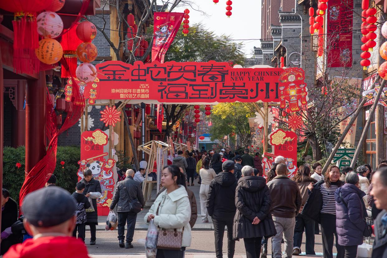 1月31日,农历新年初三,成都市崇州唐人街唐风蜀韵景区,一系列新春活动轮番上演,成都2025新春大集“蓉品优选 年货满满”潮流集市在此开展,与市民游客共庆首个非遗年。