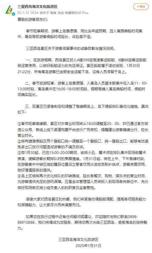 三亚西岛景区关于游客滞留事件的诚挚致歉与情况说明。