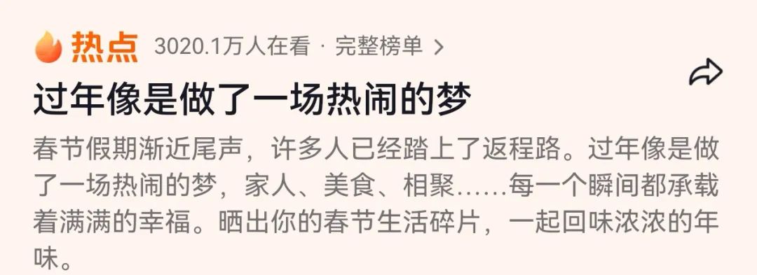 2月4日,大年初七,春节假期进入尾声,“打工人”踏上了返回工作城市的路。当日,“过年像是做了一场热闹的梦”登上某社交平台热搜,3020多万网友热议。