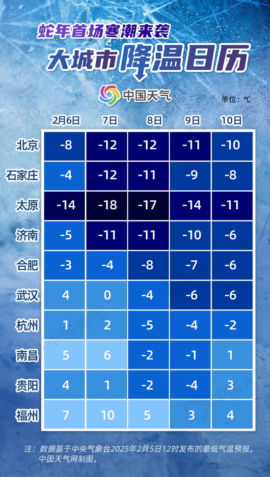 从中国天气网推出的大城市降温日历可以看出,2月6日至10日,北方多地最低气温将降至-10℃以下,南方不少城市也会不足0℃。此次降温核心区域华北、黄淮一带可谓冷上加冷,7日太原的最低气温将降至-18℃,北京、石家庄可跌至-12℃,济南最低-11℃,天寒地冻。