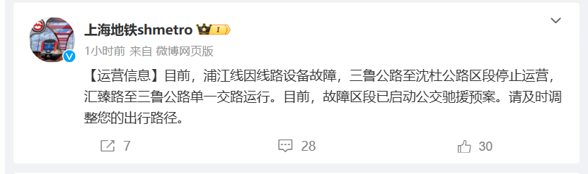2月8日7时13分,@上海地铁shmetro发布运营信息:目前,浦江线因线路设备故障,三鲁公路至沈杜公路区段停止运营,汇臻路至三鲁公路单一交路运行。目前,故障区段已启动公交驰援预案。请及时调整您的出行路径。