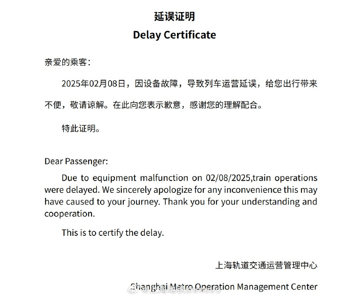 7时21分,@上海地铁shmetro发布消息称,浦江线故障已排除,运营逐步恢复正常,给您的出行带来不便,敬请谅解。上海地铁随后发布延误证明,并表示,受浦江线故障影响的乘客可通过上海地铁官网运营专页获取致歉信。