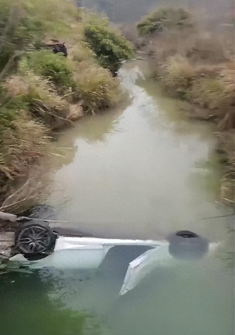 网上一段16秒视频显示,一条两岸长满嵩草的小河里有一辆乳白色小轿车,四轮朝天,两岸围着一些人,平坦的事发现场有医护人员正在紧张急救。