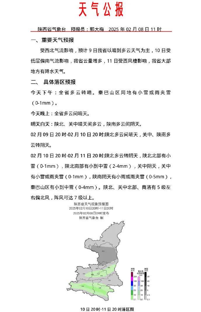 陕西省气象台2025年02月08日10时发布未来24小时灾害性天气预报: