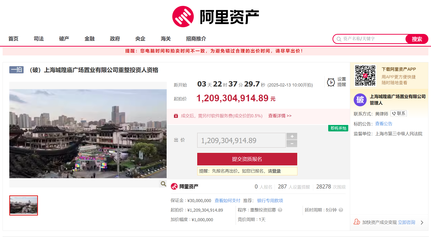 竞买公告提到,因上海城隍庙广场置业有限公司名下有坐落于上海核心区域的大型不动产项目,商业价值较大,有良好的发展前景,尚有重整价值及可能,管理人在破产清算阶段通过公开预招募的方式,招募到一家重整投资金额报价为人民币1209304914.89元的意向投资人,并已向其收取投资保证金3000万元。为了维护全体债权人利益,进一步争取更优投资方案,经征询主要债权人的意见,管理人以目前已缴纳投资保证金的意向投资人为托底投资人,以目前托底投资人的重整投资金额报价为起拍价,将于2025年2月13日10时起至2025年2月14日10时,以公开竞价的方式对城隍庙公司重整投资人资格进行二轮招募。这才有了此次拍卖。