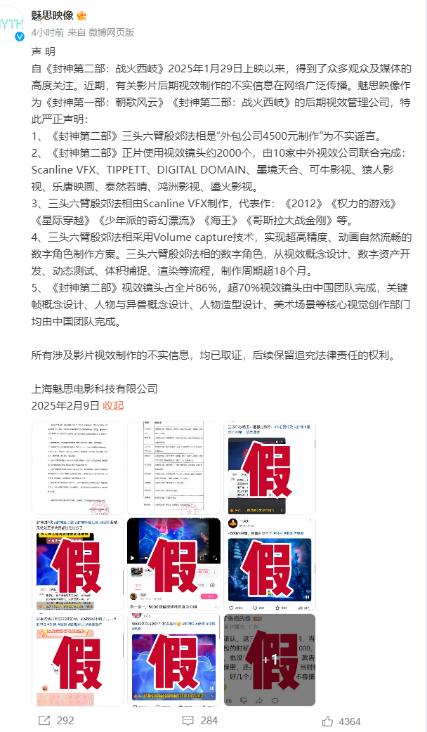 声明原文如下:自《封神第二部:战火西岐》2025年1月29日上映以来,得到了众多观众及媒体的高度关注。近期,有关影片后期视效制作的不实信息在网络广泛传播。魅思映像作为《封神第一部:朝歌风云》《封神第二部:战火西岐》的后期视效管理公司,特此严正声明:1、《封神第二部》三头六臂殷郊法相是“外包公司4500元制作”为不实谣言。2、《封神第二部》正片使用视效镜头约2000个,由10家中外视效公司联合完成:Scanline VFX、TIPPETT、DIGITAL DOMAIN、墨境天合、可牛影视、猿人影视、乐唐映画、泰然若晴、鸿洲影视、鎏火影视。3、三头六臂殷郊法相由Scanline VFX制作,代表作:《2012》《权力的游戏》《星际穿越》《少年派的奇幻漂流》《海王》《哥斯拉大战金刚》等。4、三头六臂殷郊法相采用Volume capture技术,实现超高精度、动画自然流畅的数字角色制作方案。三头六臂殷郊法相的数字角色,从视效概念设计、数字资产开发、动态测试、体积捕捉、渲染等流程,制作周期超18个月。5、《封神第二部》视效镜头占全片86%,超70%视效镜头由中国团队完成,关键帧概念设计、人物与异兽概念设计、人物造型设计、美术场景等核心视觉创作部门均由中国团队完成。所有涉及影片视效制作的不实信息,均已取证,后续保留追究法律责任的权利。上海魅思电影科技有限公司2025年2月9日