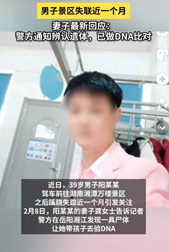 近日,39岁男子阳某某驾车前往湖南湘潭万楼景区,之后蹊跷失踪近一个月引发关注。2月8日,阳某某的妻子龚女士告诉记者,警方在岳阳湘江发现一具尸体,让她带孩子去验DNA。“中午12点,殡仪馆的人打电话给我了,说了特征,可能就是我老公了。警察也给我们看了照片,应该就是他了。”