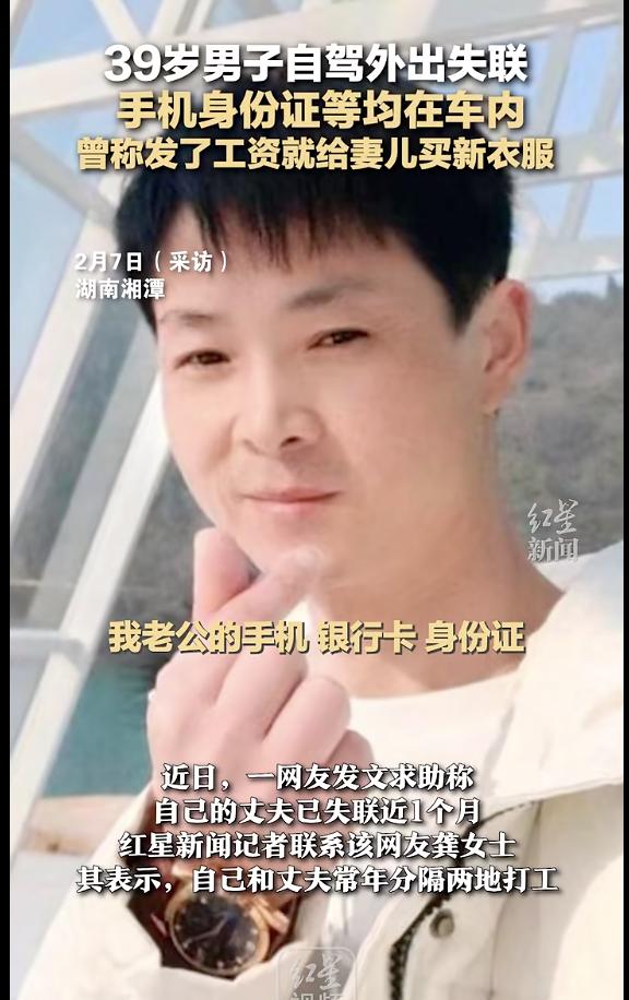 龚女士介绍,她在深圳上班,丈夫在湘潭某公司就职。1月15日,她发现丈夫不回信息,后拨通电话无人接听。随后,龚女士联系丈夫所在公司,工作人员表示龚女士丈夫已经好几天没有到岗。报警后,龚女士从警方处了解到,其丈夫的私家车在湘潭一景区内被找到,当时车门未锁,手机、银行卡、身份证、钱包、车钥匙等都在车上,银行卡里还有2万多元。警方通过查看监控,发现1月9日下午5时左右,她的丈夫来到湘潭万楼景区,在那里面逗留了大约两小时后失联。