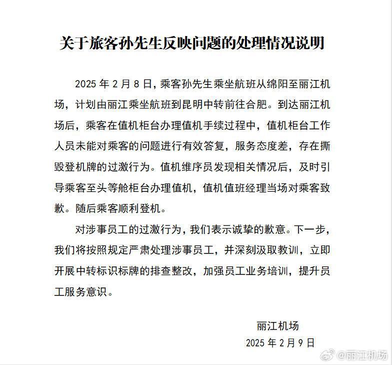 丽江机场在“情况说明”中表示,2025年2月8日,乘客孙先生乘坐航班从绵阳至丽江机场,计划由丽江乘坐航班到昆明中转前往合肥。到达丽江机场后,乘客在值机柜台办理值机手续过程中,值机柜台工作人员未能对乘客的问题进行有效答复,服务态度差,存在撕毁登机牌的过激行为。值机维序员发现相关情况后,及时引导乘客至头等舱柜台办理值机,值机值班经理当场对乘客致歉。随后乘客顺利登机。
