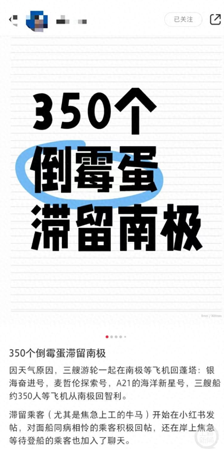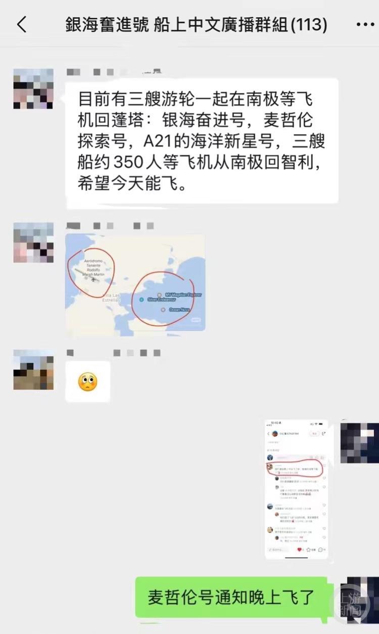 多名网友帖子显示,2月5日左右,银海奋进号、麦哲伦探索号、A21公司的海洋新星号3艘游轮上大约有350名游客,因为恶劣天气导致航班取消,被滞留在南极乔治王岛。加上此前等待飞机前往南极的游客,大概共有700人左右。一名被困网友表示,由于不能下船活动,船上WiFi也有限制,无法流畅刷视频消磨时间,只能在小红书等社交平台上发帖聊天。不过这名网友表示,虽然出现了滞留的情况,但这段时间的餐饮、住宿等不会另外收费。“除了那些着急回去上班的游客,其它游客倒是比较满意。”
