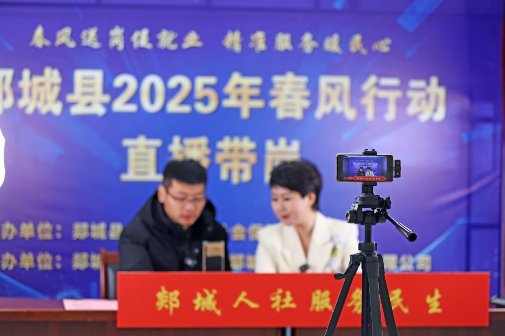 2月8日,工作人员在山东省临沂市郯城县“春风行动”专场招聘会现场进行直播带岗。新华社发(张春雷摄)