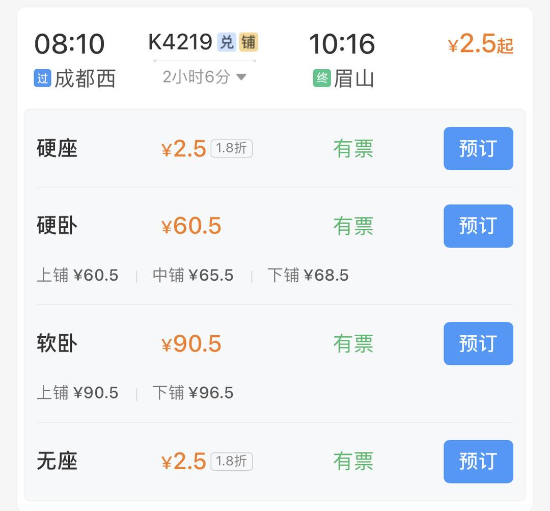 成都西至眉山硬座票仅需2.5元