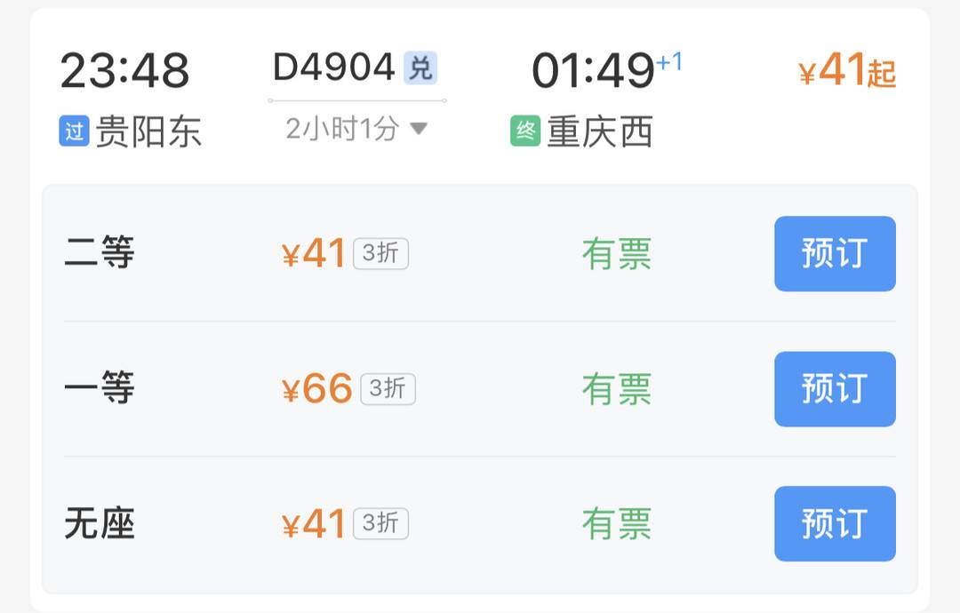 贵阳东至重庆西二等座车票仅需41元
