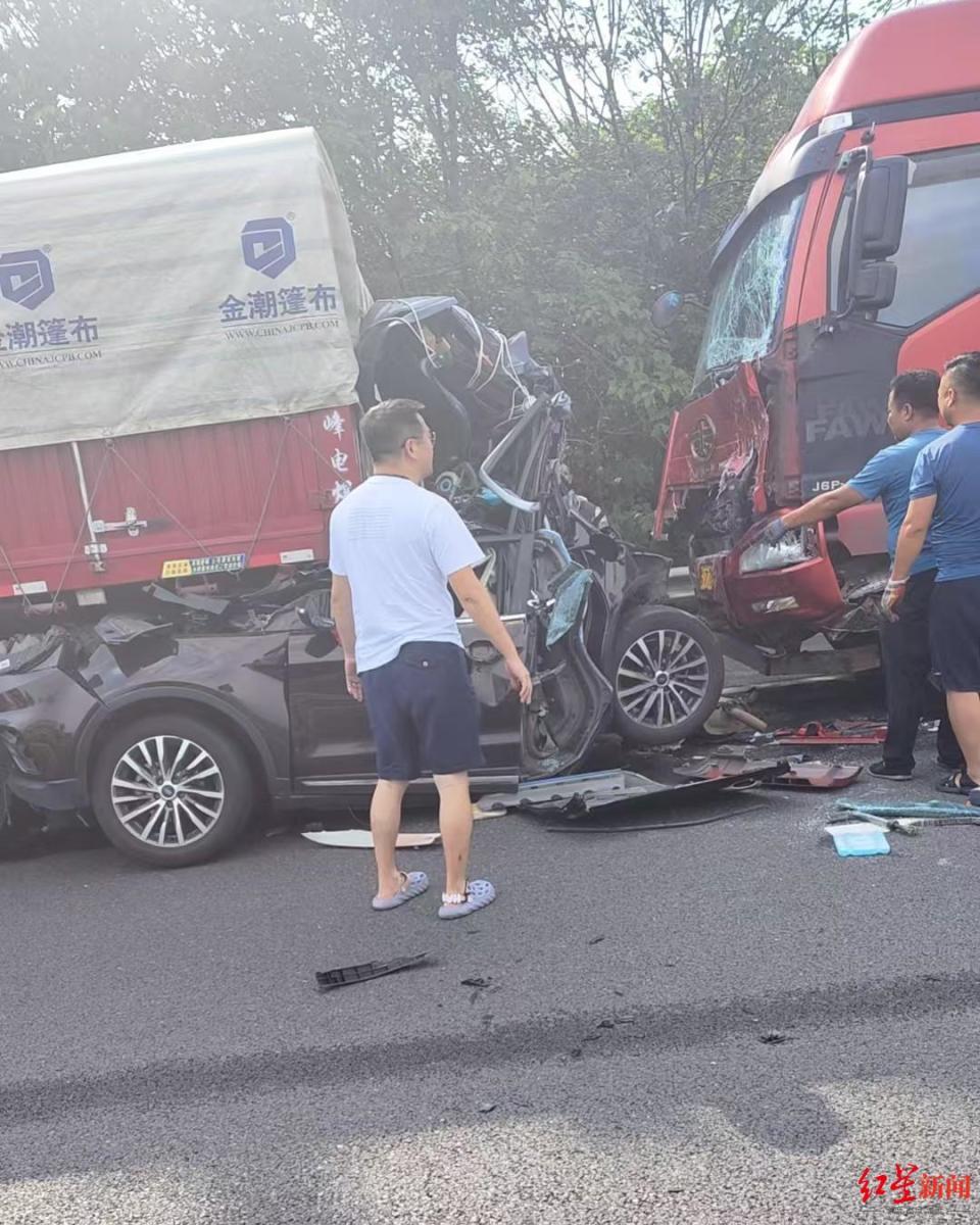 “我前方是一辆半挂车,我们相距1.5米~2米。”郝女士至今记忆犹新,她告诉红星新闻记者,停车时她还跟丈夫说“还有一个多小时就到(成都)了”,正准备给儿子说话时,后方突然来了一辆大货车,径直撞上了她的车,并将车推撞上前方的半挂车尾部。