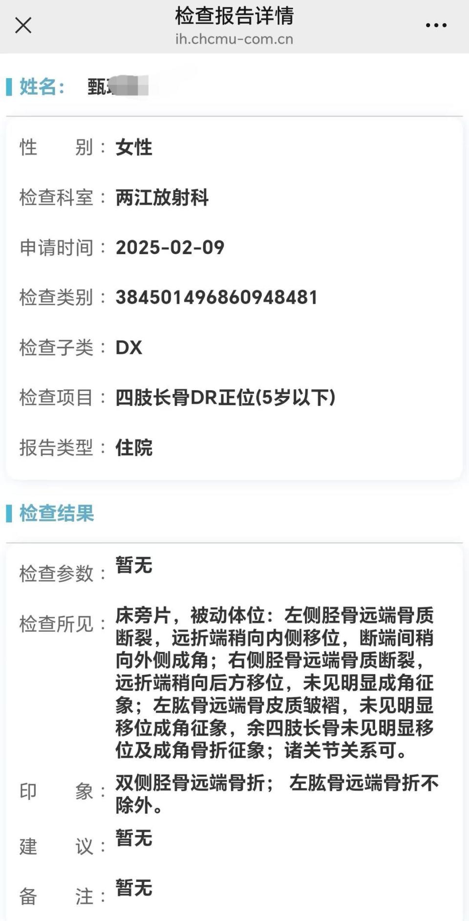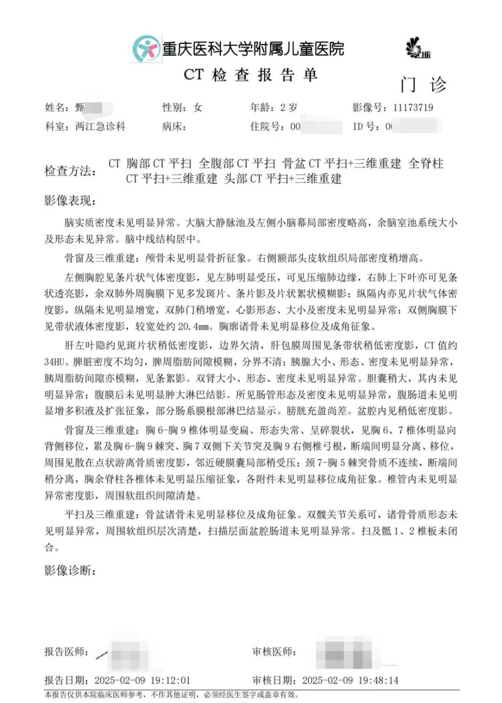 甄星星提供的医院检查报告显示,在10日检查胸椎、腰椎、颈椎、颅脑等后发现,女儿存在“胸6-胸9爆裂性骨折”“颈7-胸5附件骨折”“胸4-9水平椎管内广泛异常信号,考虑脊髓损伤、出血可能”等情况。超声、CT检测等显示,考虑脾脏挫裂伤,左肺明显受压等。