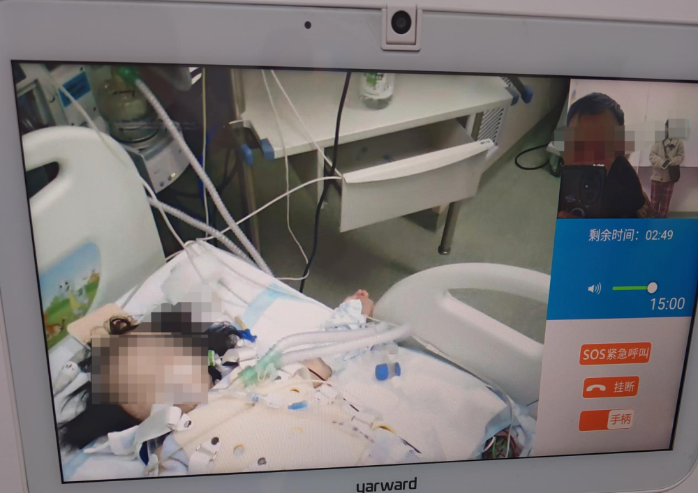 ▲家人通过视频探视病床上的孩子