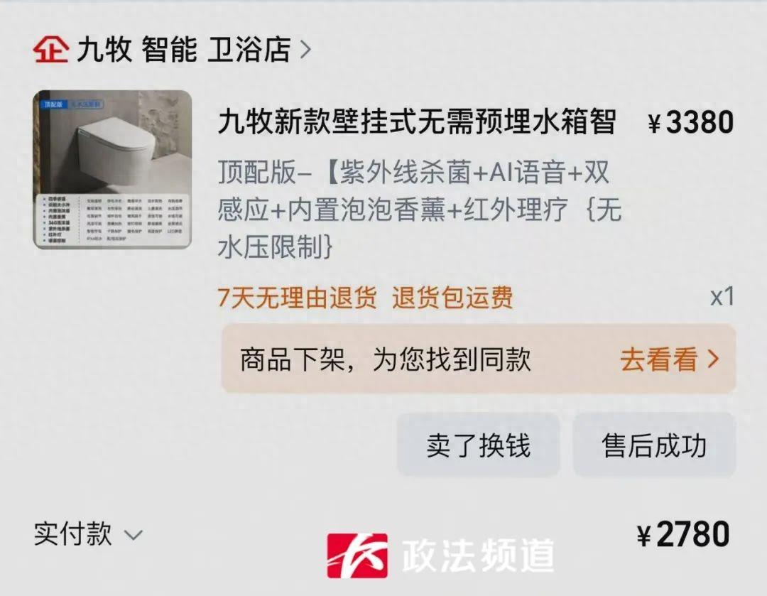 长沙市民肖女士向记者反映,自己去年网购马桶,结果只收到商家发来的马桶支架,今年,她再次联系商家的时候,竟发现这家店“没了”。肖女士讲述,2024年10月19日,她在淘宝上一家名为“九牧智能卫浴店”的网店以2780元的价格购买了一个九牧新款壁挂式智能马桶顶配版,至今,她只收到商家发的马桶支架。