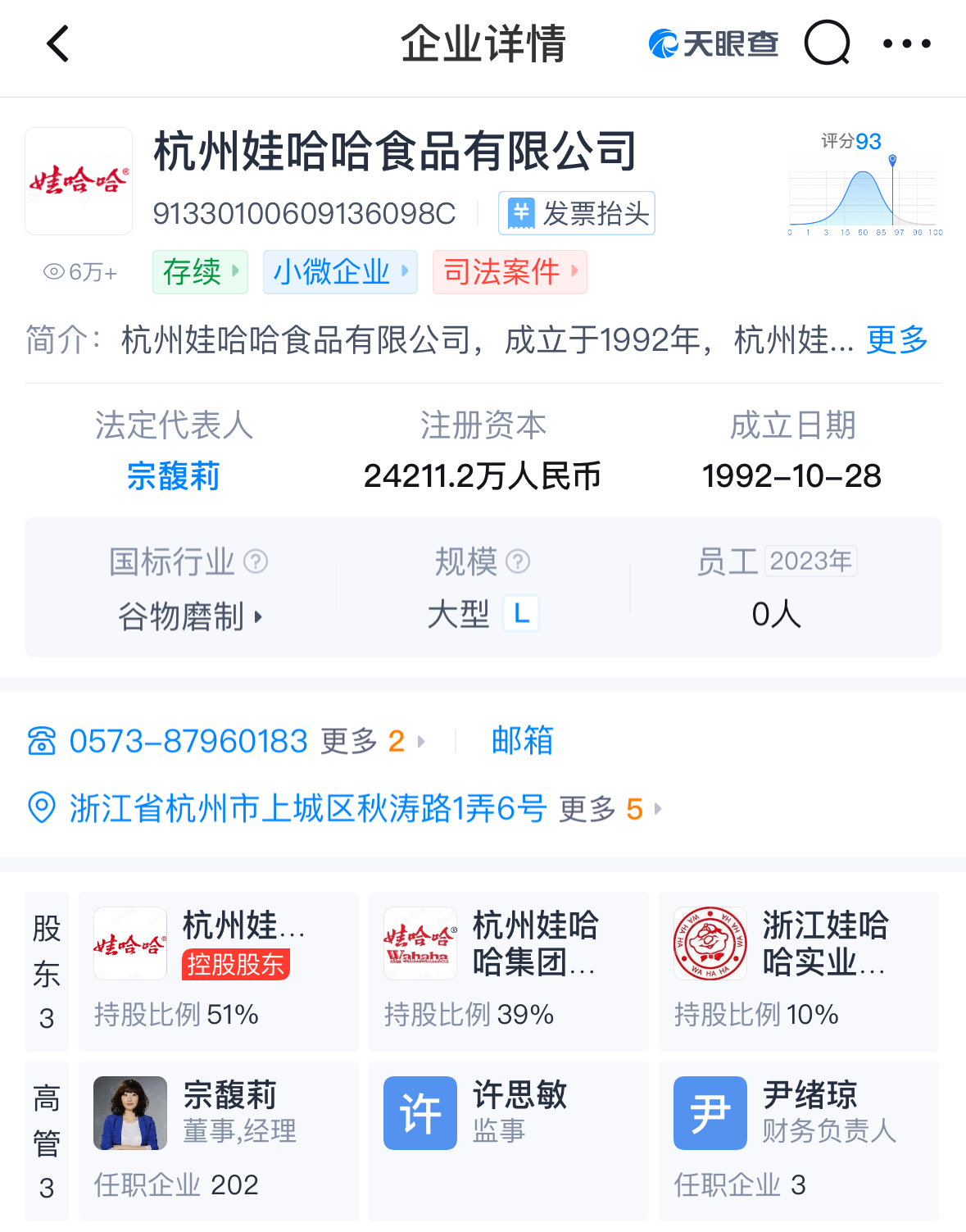 天眼查App显示,上文提及的“娃哈哈”商标受让方娃哈哈食品有限公司,由杭州娃哈哈宏振投资有限公司(以下简称:“宏振投资”)、杭州娃哈哈集团有限公司、浙江娃哈哈实业股份有限公司共同持股,上述股东分别持股51%、39%和10%。