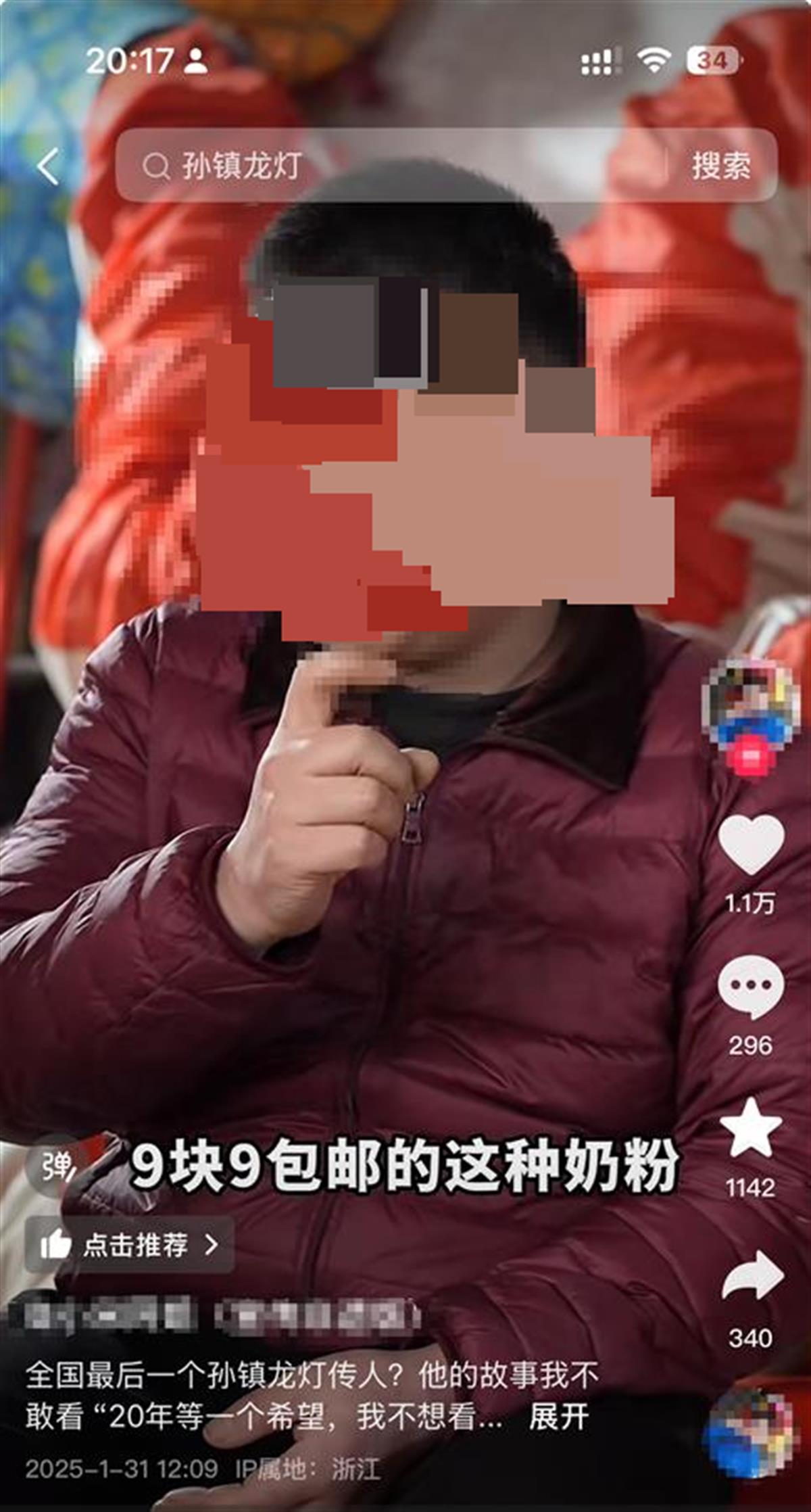 孙某某也在社交平台开设了账号。2月9日,他发布视频称,自己面临实际困难,“如果我选择回归家庭,我坚守的20多年的孙镇龙灯也将再次面临失传和消亡”,希望网友们帮他出出主意。有网友在该视频评论区质疑他:给刚出生的孩子吃几块钱奶粉,怎么想的?做非遗传承人影响做父母吗?孙某某则回答:“2014年是我穷困潦倒的至暗时刻,那是我能买得起的,唯一能选择的奶粉。”