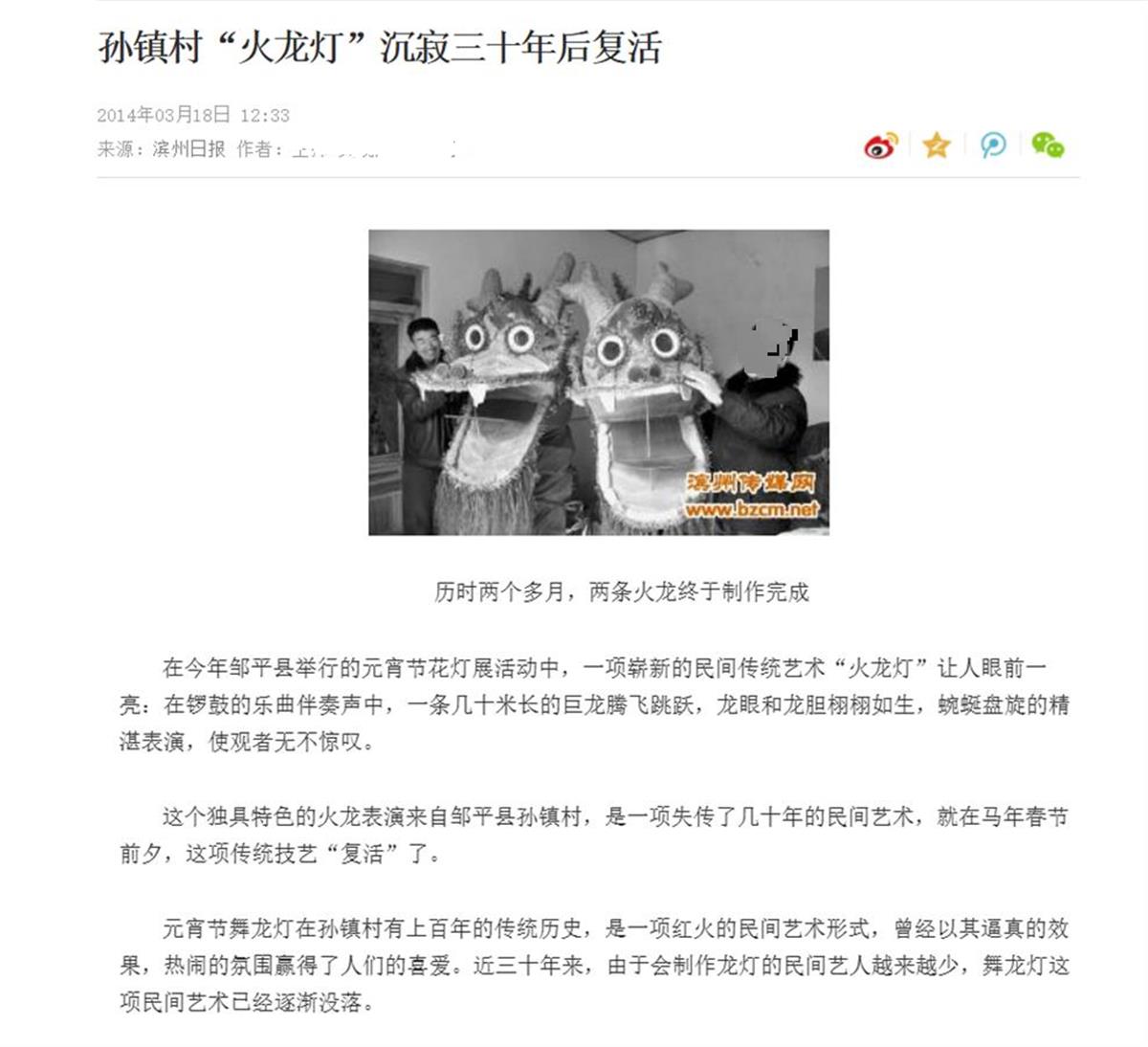 极目新闻记者注意到,关于孙某某传承孙镇龙灯,这些年已有多家媒体报道。2014年3月,滨州日报报道,为保留民间艺术,重拾龙灯文化,从2013年上半年开始,孙镇村村民孙某某积极组织龙灯制作老艺人,聚在一起编制龙灯。历时两个月,两条火龙灯终于制作完成。孙某某找来四十多人,训练舞龙,不到两天的时间,组成了队伍,并在元宵节花灯展活动中,让人眼前一亮。